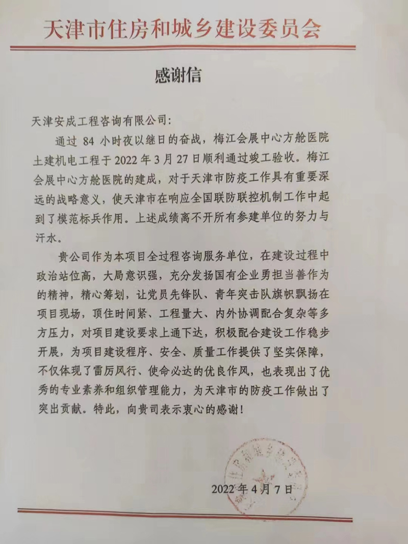 經(jīng)過84小時(shí)夜以繼日的奮戰(zhàn),梅江會(huì)展中心土建機(jī)電工程于2022年3月27日順利通過竣工驗(yàn)收。4月7日,天津市住房和城鄉(xiāng)建設(shè)委員會(huì)向安成公司發(fā)來感謝信,對安成公司在項(xiàng)目建設(shè)過程中體現(xiàn)出的雷厲風(fēng)行、使命必達(dá)的優(yōu)良作風(fēng)以及優(yōu)秀的專業(yè)素養(yǎng)和組織管理能力給予了高度認(rèn)可。