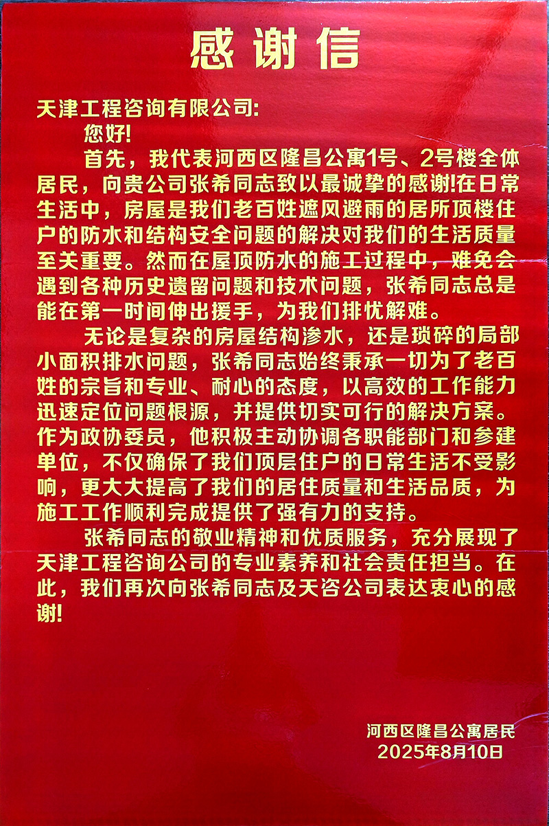 為有效促進(jìn)工程進(jìn)展,項目團(tuán)隊主動加強(qiáng)與居民、街道和社區(qū)的多層次溝通。在各小區(qū)設(shè)立聯(lián)絡(luò)點(diǎn),及時公開施工與監(jiān)理信息,迅速響應(yīng)居民關(guān)切。如隆昌公寓屋面滲水問題,團(tuán)隊僅用三天便協(xié)調(diào)解決,展現(xiàn)出高效務(wù)實的作風(fēng)。施工前主動告知計劃,協(xié)助居民做好防護(hù),合理安排作業(yè)時間避開休息時段,還為年長體弱居民提供搬運(yùn)幫助。這些細(xì)致入微的服務(wù)贏得了居民的廣泛贊譽(yù),特地送來感謝信,表揚(yáng)團(tuán)隊“專業(yè)、耐心、高效”。