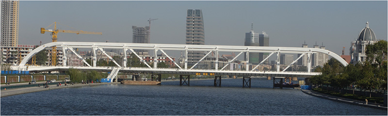 該橋橫跨張自忠路、海河以及海河東路。橋梁總長180米,主跨128米,面積4985.2 平米,為自錨式桁吊組合鋼結構橋??偼顿Y2.65億元。該橋梁設計在國內外尚屬首創(chuàng)。