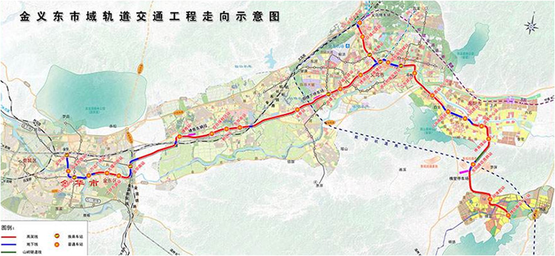 項目建設(shè)規(guī)模由金華—義烏和義烏—東陽兩條線路組成,兩線在秦塘站呈雙島四線同站臺換乘。其中,金華—義烏線起于金華火車站,沿雙龍街-李漁路-李漁東路-站前路-金義新區(qū)新城路-規(guī)劃國貿(mào)大道二期-國貿(mào)大道一期,止于義烏秦塘站;義烏—東陽線起于義烏火車站,沿宗澤路-國貿(mào)大道-商城大道-陽光大道-世茂大道-興平路-迎賓大道-S218-鎮(zhèn)北路-萬盛北街-橫店環(huán)城東路,止于橫店客運中心。兩條線路總計全長約107.18公里,共設(shè)站31座(其中地下站13座,高架站18座),設(shè)一段三場,建設(shè)地址位于金華地區(qū)(含金華市婺城區(qū)、金東區(qū)、義烏市、東陽市),計劃于2021年建成。